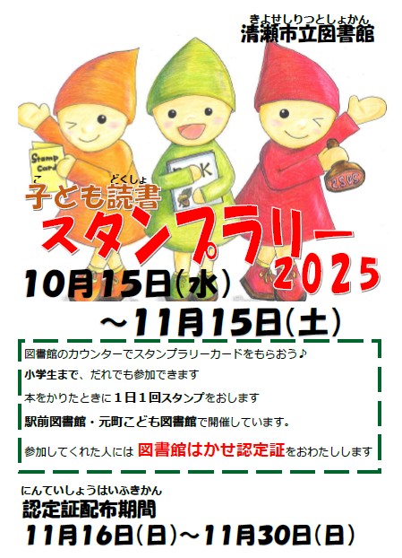 | 詳細内容 | 「子ども読書スタンプラリー」 子ども読書スタンプラリーを実施します。 下記期間中、駅前図書館・元町こども図書館で本を借りた方には、スタンプラリーカードにスタンプを1つ(1日1回)押します。参加者には「図書館はかせ認定証」を渡します。 参加をご希望の方は、駅前図書館・元町こども図書館カウンターへ直接お声掛け下さい。 対象 小学生まで 場所 駅前図書館・元町こども図書館 スタンプラリーカード配布期間・スタンプ押印期間 10月15日(水曜日)から11月15日(土曜日) 認定証配布期間 11月16日(日曜日)から11月30日(日曜日) 問い合わせ先 駅前図書館 042-492-8751(月曜日休館) |